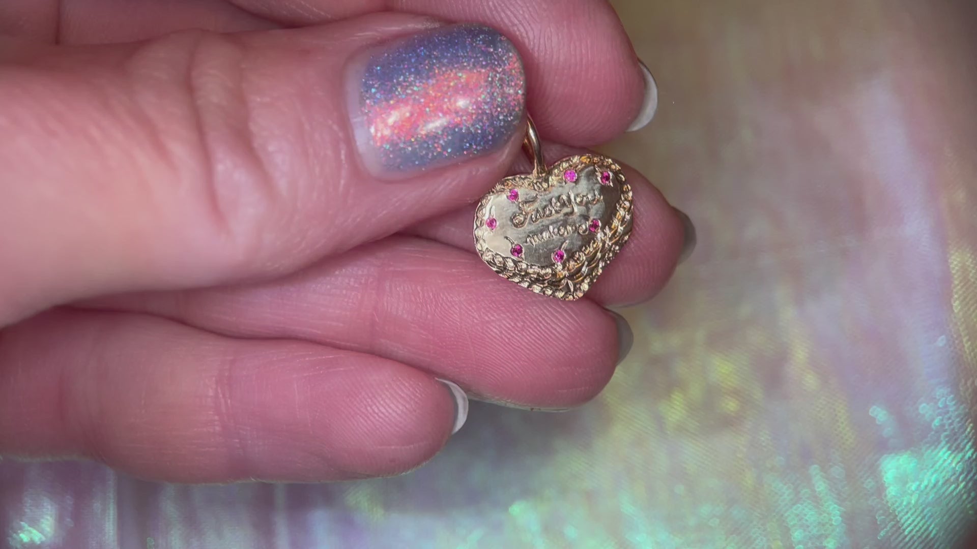 vintage shaped heart cake charm in 14k yellow gold with tiny ruby cherries, and a lil mantra "fuck you make me"