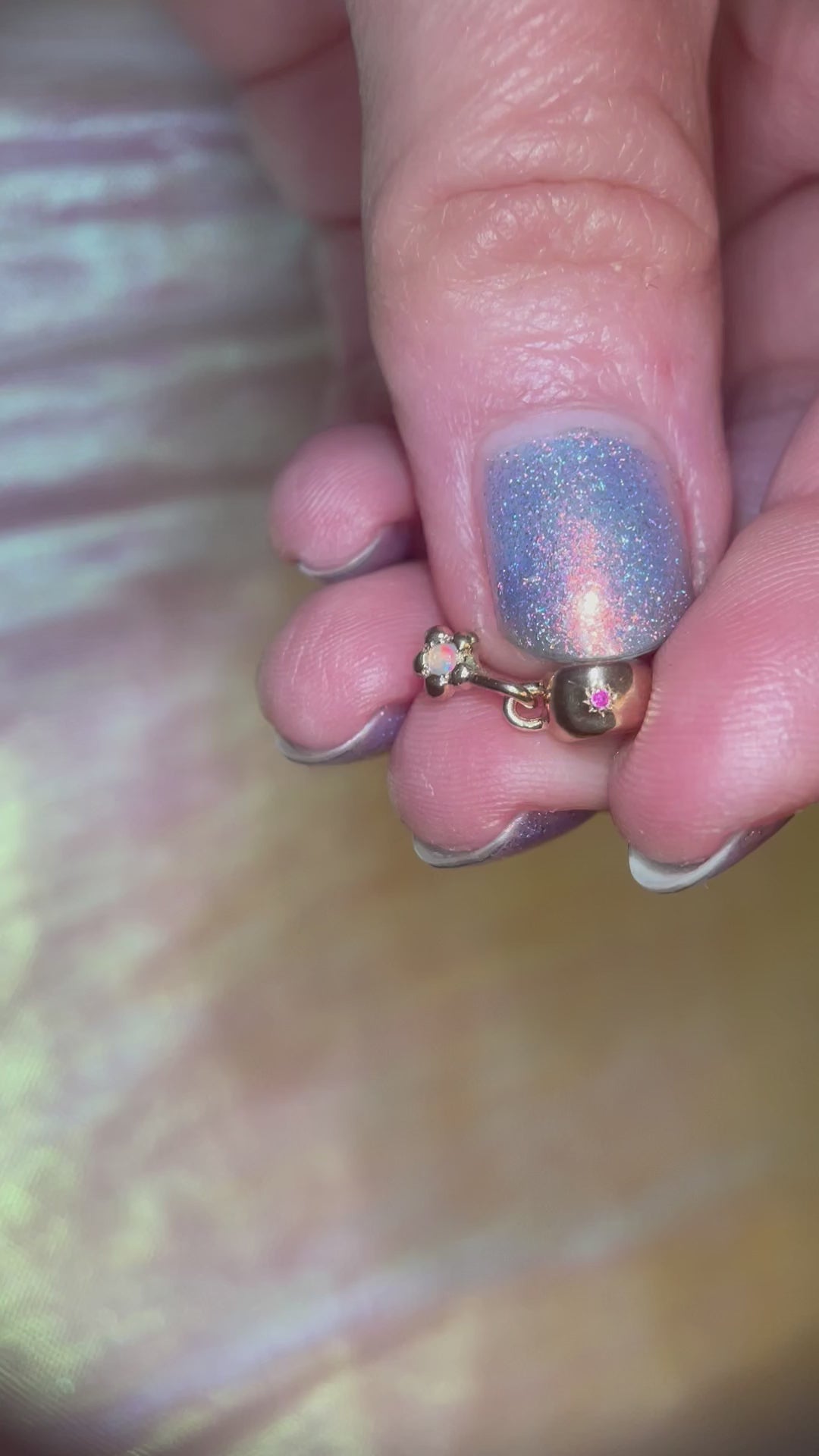 we got a twofer! a bead spacer with a mini daisy dangly. 14k yellow gold, 1mm ruby and. a 2mm opal.