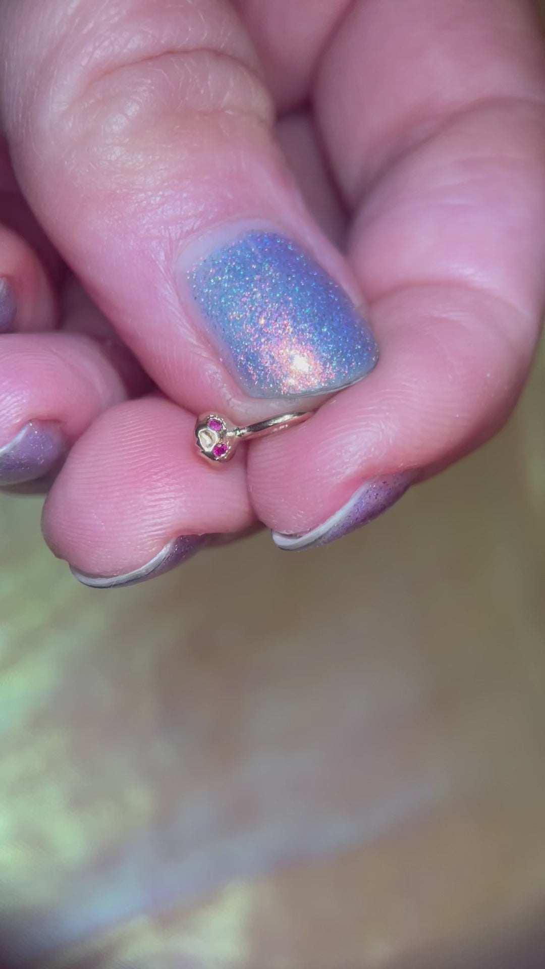 itty bitty skull with ruby eyes 14k yellow gold, 1mm eyesmeasures 4.2mm wide by 3mm tall not including bailmade by me in the ruins of portland,...